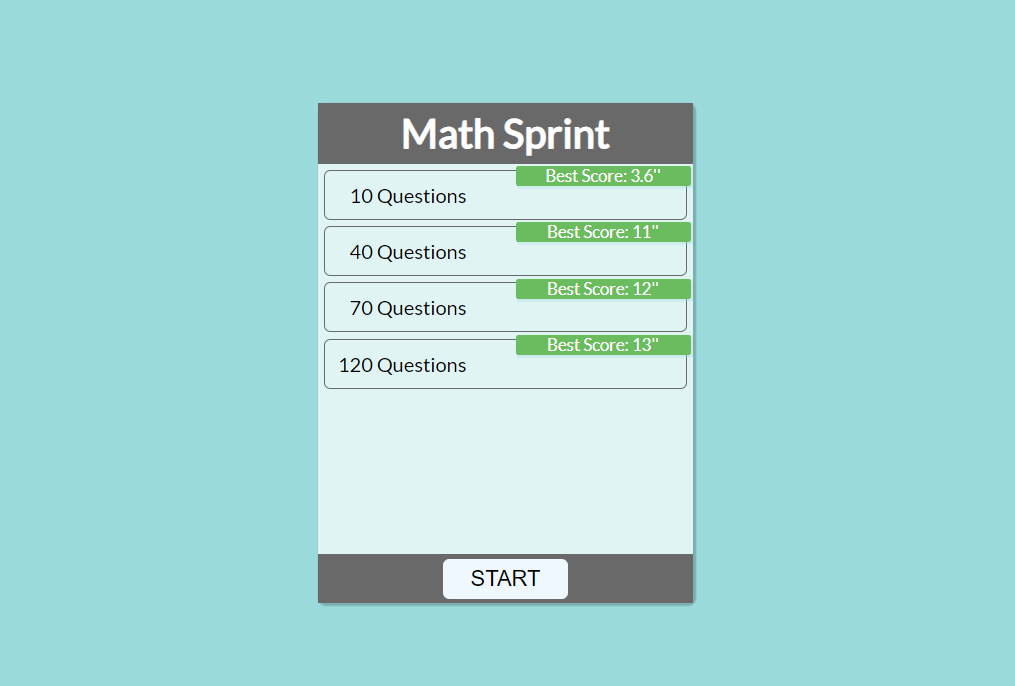 Math Sprint 10 questions best score: 40 questions best score: 70 questions best score: 120 questions best score: 1 2 3 Go 1 1 1 1 your time 11s base time: penalty: start wrong correct