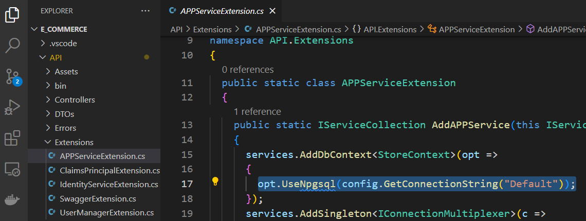 커넥션 스트링이라는 변수 명으로 지정한 경우 아래와 같이 커넥션스트링을 가져오는 메서드를 통해 커넥션 스트링 하위에 지정한 변수들의 이름을 통해 사용합니다