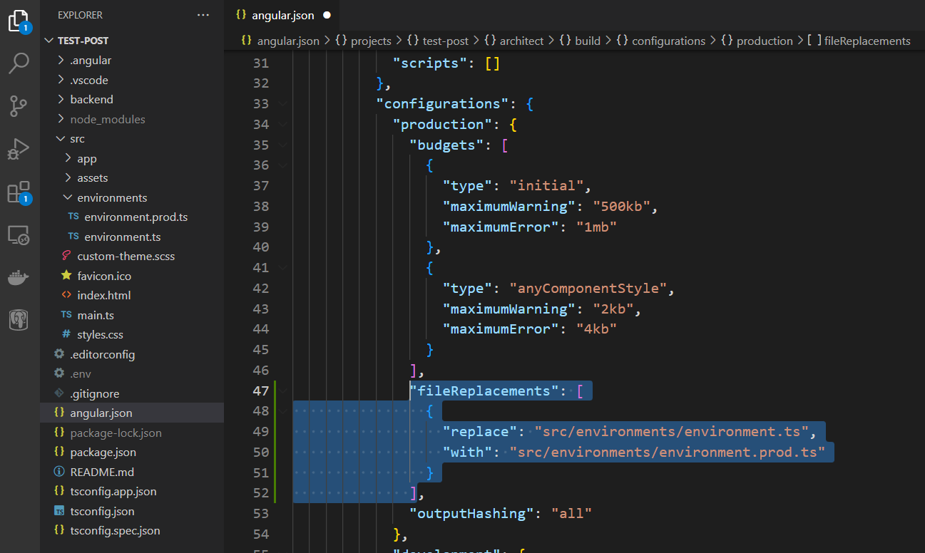 배포 시 자동으로 프로덕션 변수를 사용하도록 angular.json 파일의 프로덕션 설정에 아래 설정코드를 추가합니다