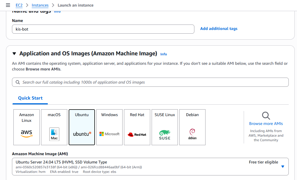 t2.micro또는t3.micro)을 선택하고, AMI(운영체제 이미지 - 저는 우분투 선택) 등 기본 설정을 진행합니다.