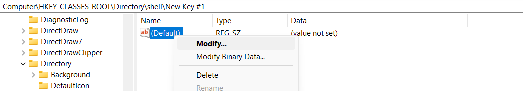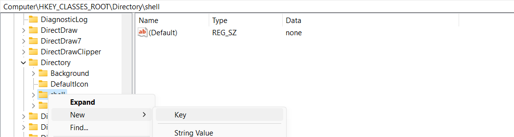 After Registry Editor is opened, scroll down and find 'Directory' -> 'shell'