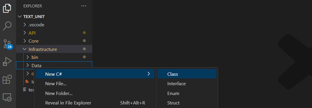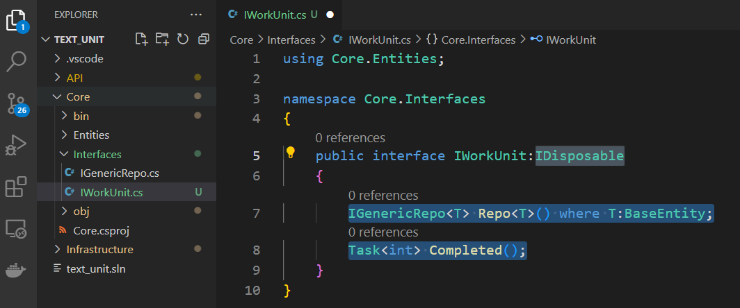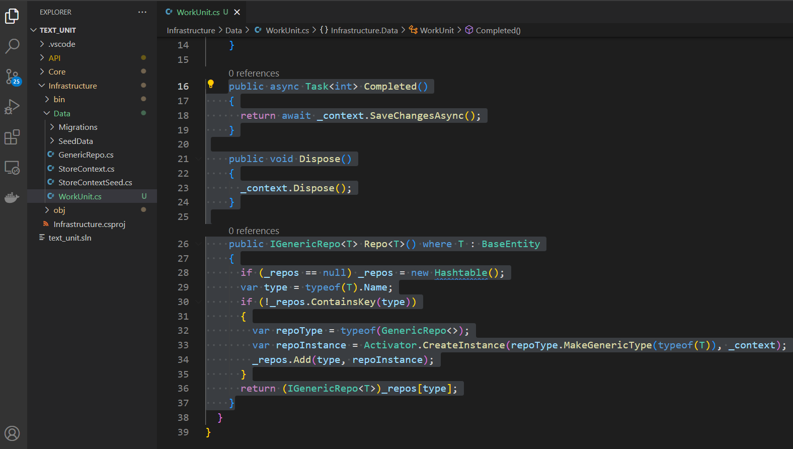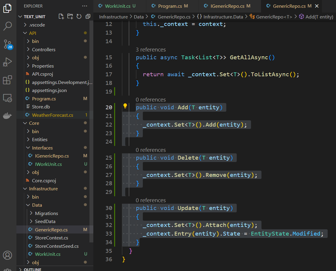 Move to the implementing class and update the implementation. Update the methods with the code shown below. Basically, the Add method will add entities but not save changes until we call the Complete