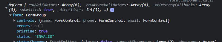 Let's submit the form to see what is inside. controls represents each input in the form. Even though we can see the form with various values we can use such as value, status, errors, touched, you will see an empty object as no controls are linked to the form yet.