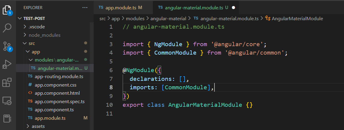 To use the library, you have to add the module to the 'app.module.ts' file. Following better practice, I am going to create a separate module for the Angular Material. Run the following command to create a new module.