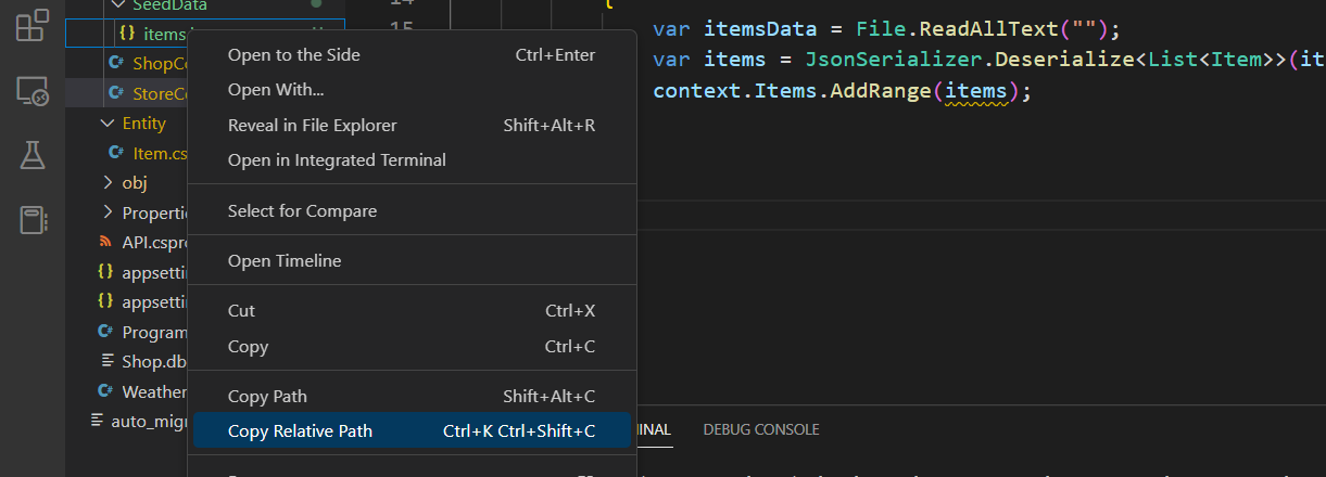 ※ Right-click the file and copy the relative path (Note that the path should be from the Program.cs file, so even if you move this file to another folder the starting point should always be the Program.cs file for this to work).