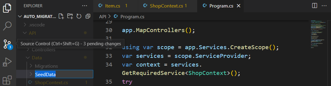 If you want to use additional features such as a service, you have to first add them to the Program.cs file. So let's open the file and add the Db Context service.