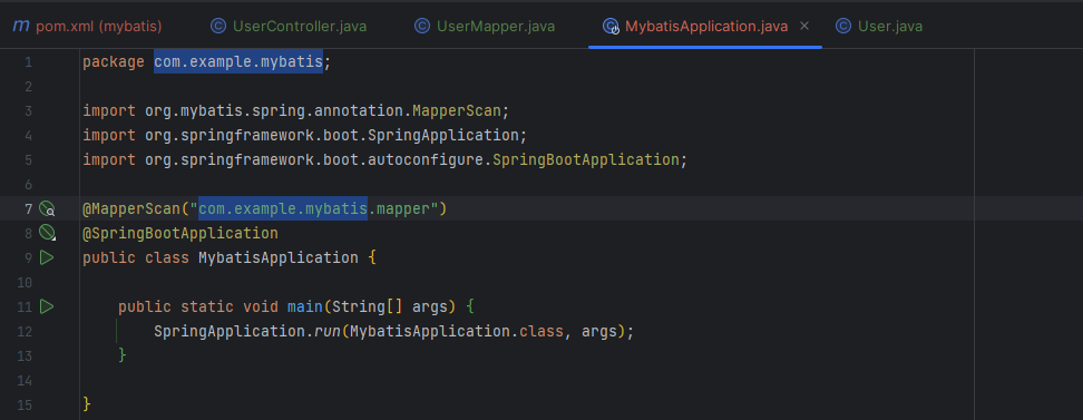 SpringApplication.run(MybatisApplication.class, args);