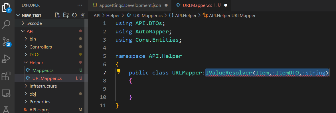 Inherit from 'IValueResolver' interface. The first value in the generic parameter is the original entity. The second and the third are the entity that we want to convert to and the type of the entity