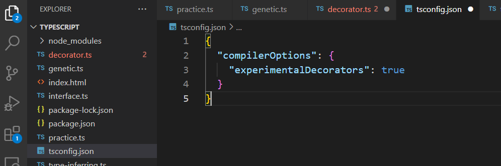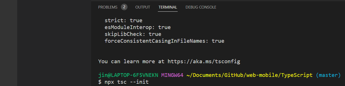 After running, a file called 'tsconfig.json' will be created. There are many options written in the file but we don't need any of them so if you want you can delete them all.