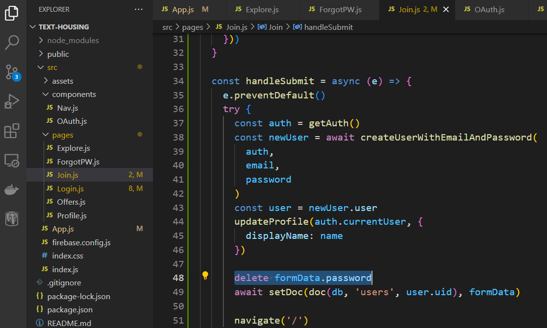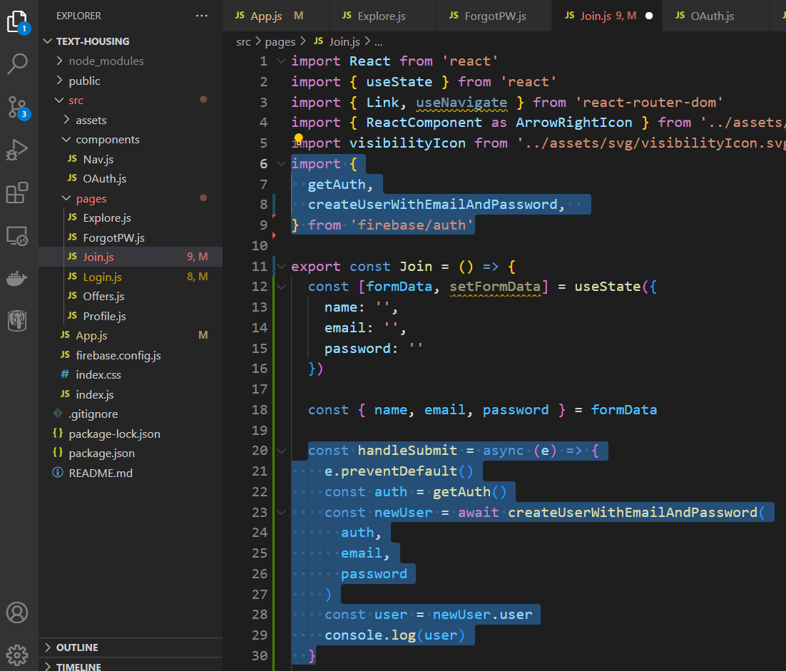 예를 들어, 파이어스토어를 활용한다면 아래처럼 파이어베이스 구성 파일, 다큐먼트 등 필요한 기능들을 가져오고