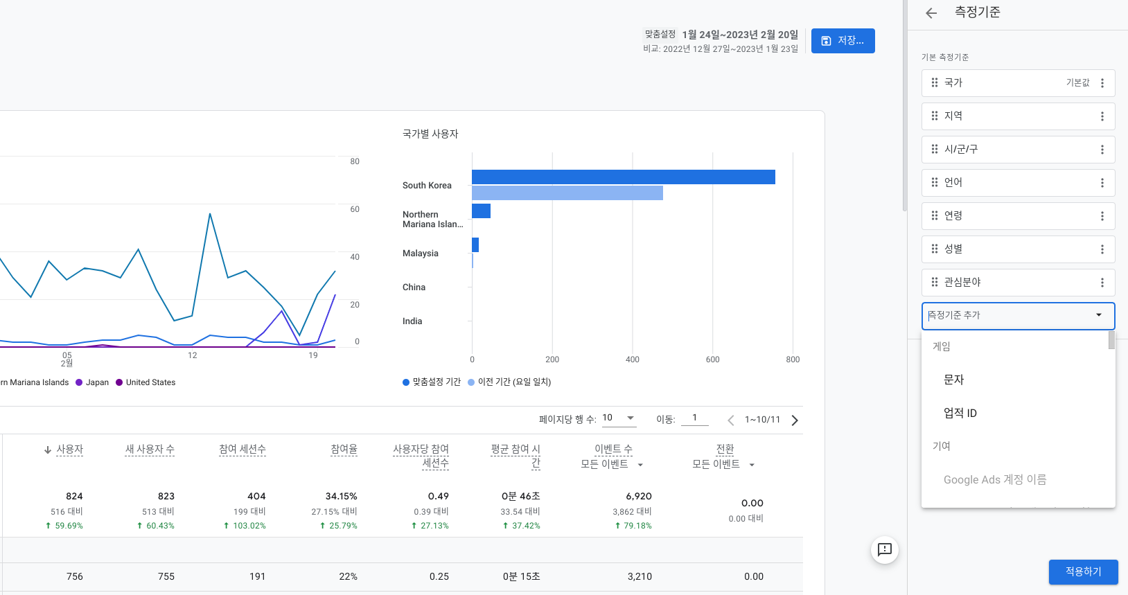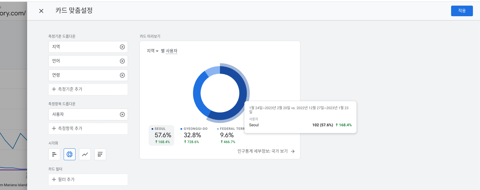 요약카드는 측정기준 -> 측정항목 -> 그래프 선택 후 필터 (선택사항) 설정 후 '적용'하면 됩니다.