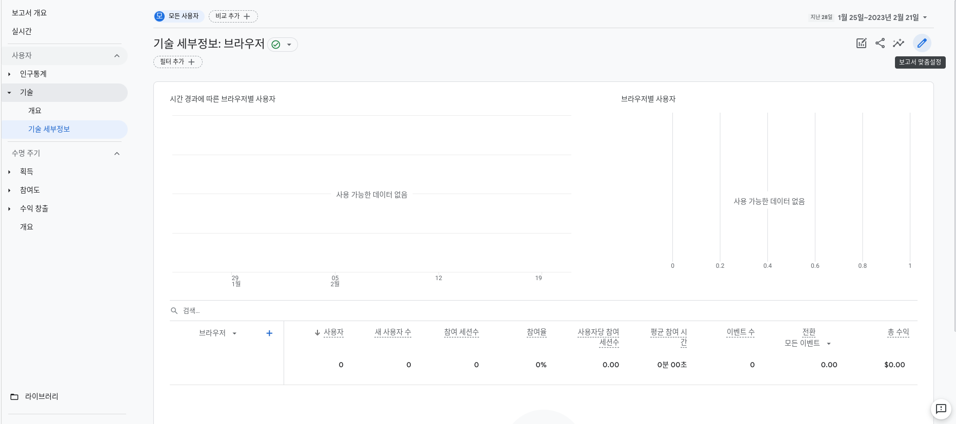 맞춤보고서는 원하는 측정기준을 사용하여 필요한 보고서를 만드는 기능으로 애널리틱스 해당 계정에 '편집' 권한을 가진 모든 사용자는 만들어진 맞춤보고서를 기존에 제공되는 기본보고서와 더불어 활용가능합니다.