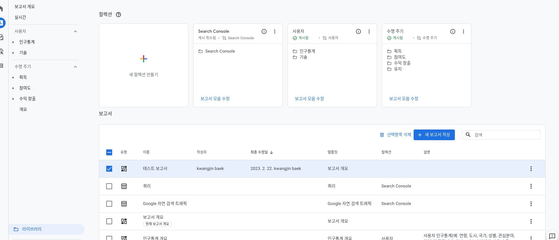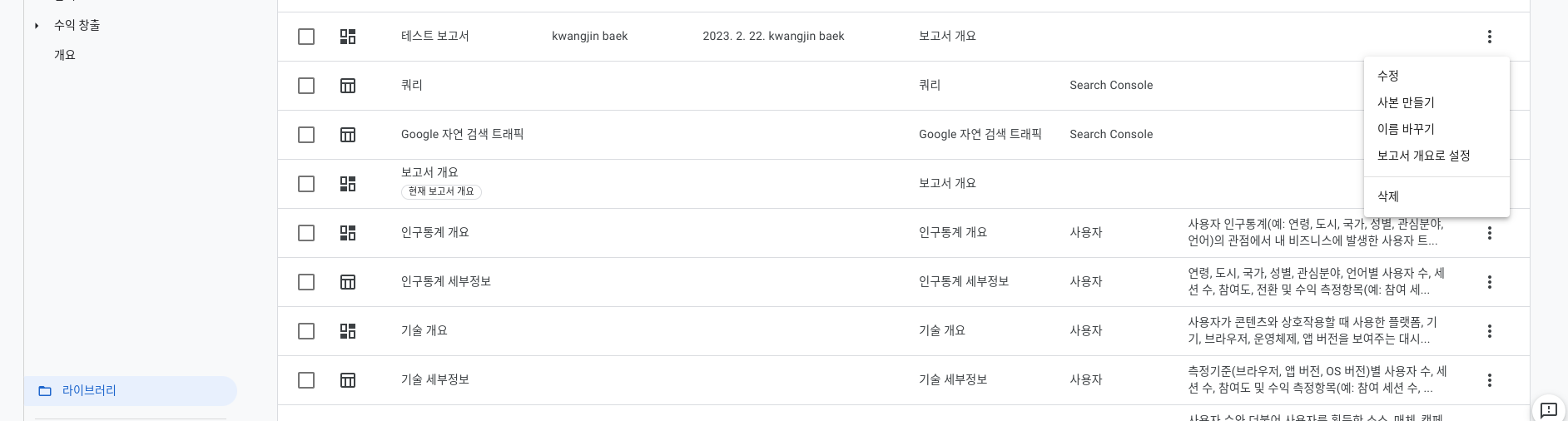 해당 보고서 우측에 점 세 개를 눌러 수정, 사본 만들기, 이름 변경, 보고서 개요로 설정, 삭제 등이 가능합니다.