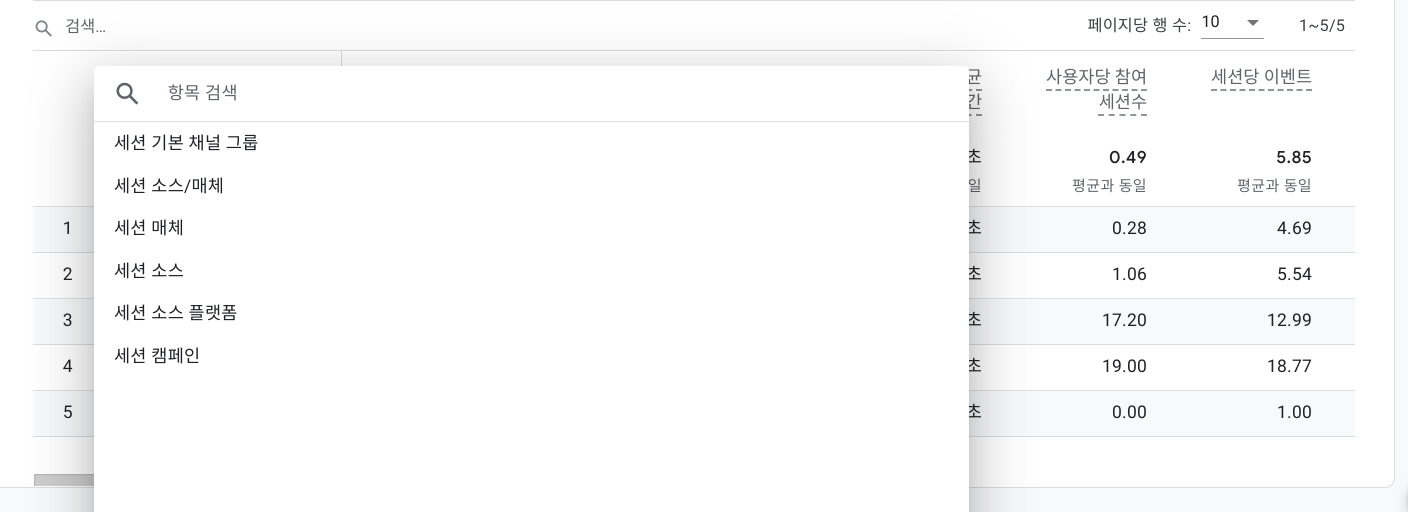 테이블 첫 번째 열에서 측정기준을 선택하여 선택된 기준의 데이터 확인이 가능합니다.