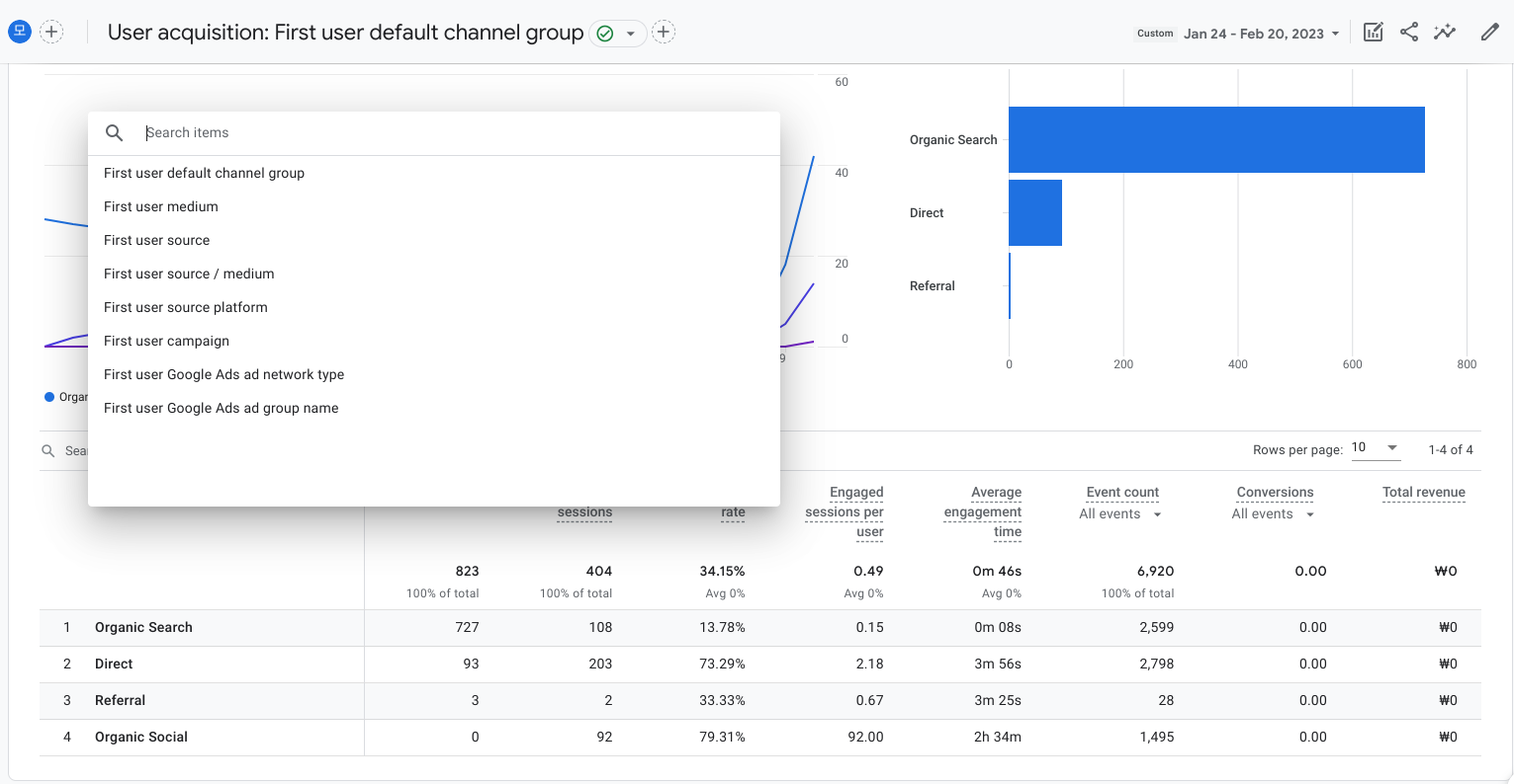 사이트로 유입되는 새 사용자들이 세션별로 어떤 소스, 미디엄 등을 통해 유입되는 지를 보여줍니다. 캠페인에 관한 정보도 여기서 확인가능한데 캠페인 정보를 확인하기 위해서는 광고 중인 구글애즈 (search ads 360 또는 display and video 360 도 가능)과 연결이 되어있거나 데이터를 가져와야 합니다.