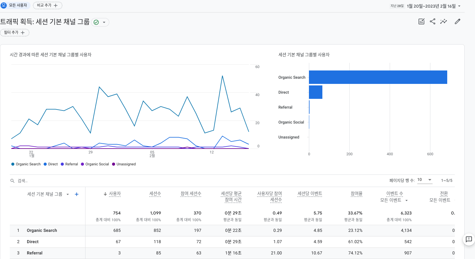 새로운 세션과 함께 유입된 사용자들이 해당 사이트에 들어온 채널의 그룹별 (기본 채널 리스트 보기)로 보고서를 생성합니다.