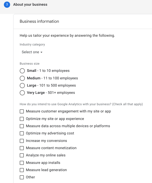 If you want to create additional properties (data streams) under the same account (business). Click the ‘+create property’ and follow the property set up above.
