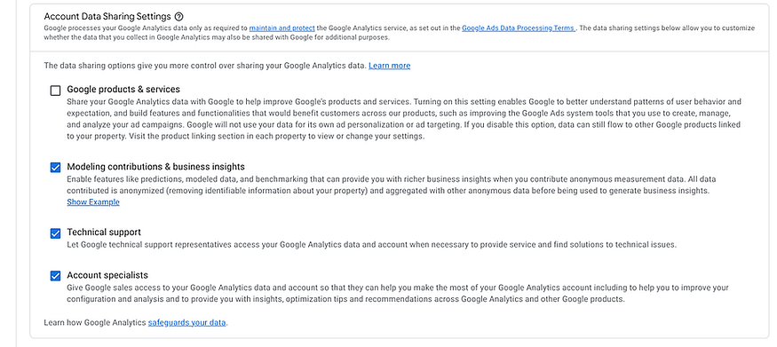 Then you will see a data sharing option which controls how the data in the Analytics will be shared with other Google products and services. Check or uncheck as you like