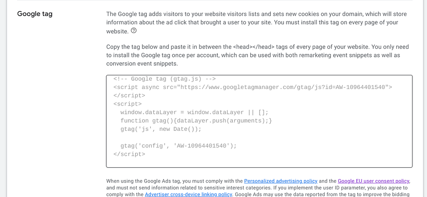 Select ‘Install the tag yourself’ then copy the code in the box. insert the code in the <head> {insert here} </head> tag of the main html