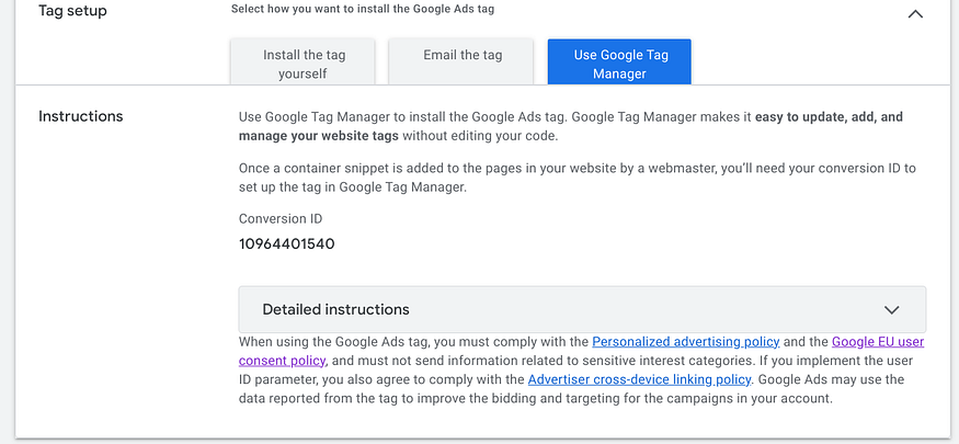 Choose ‘Use Tag Manger’ then copy the conversion ID (numbers)