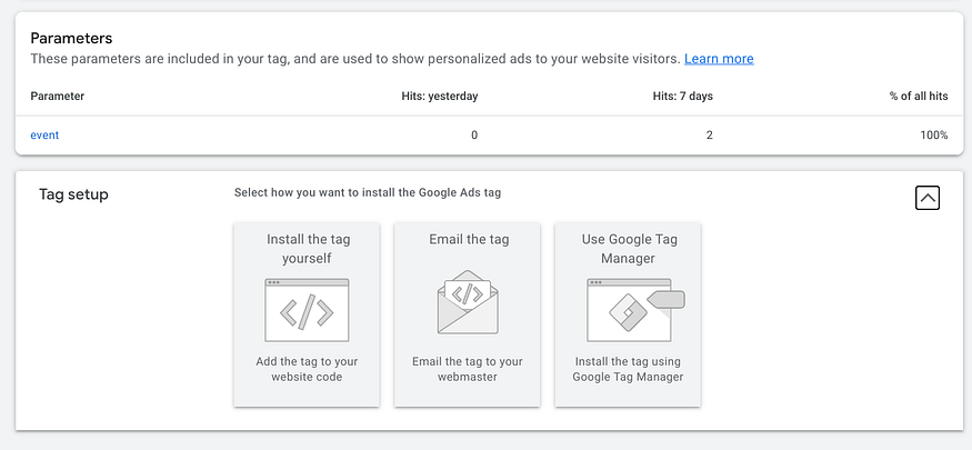 In the opened page, choose ‘Tag setup’ at the bottom. Two wasy to implement, ‘Install the tag yourself’ or ‘Use Tag Manger’