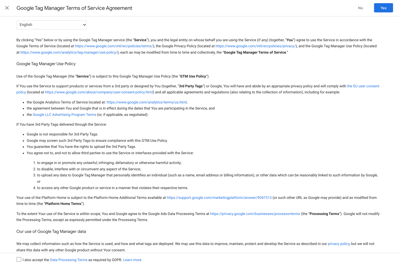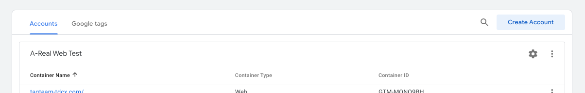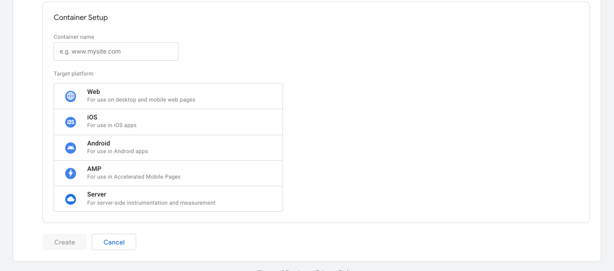 Container setup -> click ‘create’ (container name: website scope, target platform: if your platform is a website, select 'web')