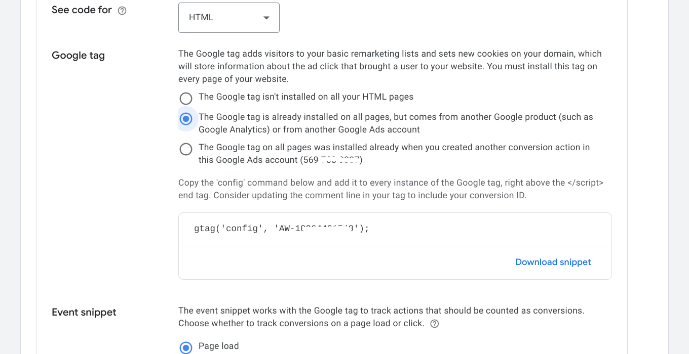 - If you have a global tag inserted but it does not include this Google Ads account configuration: