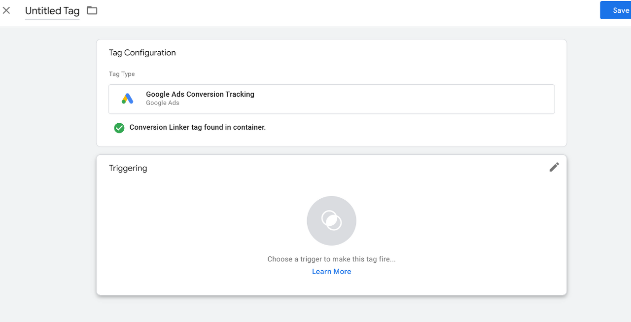 Choose a desired trigger (if you need to create your own click ‘+’ button on the top right corner) then click ‘Save’ (leave the rest as the default) on the top right corner (you might be prompted to create a conversion linker)