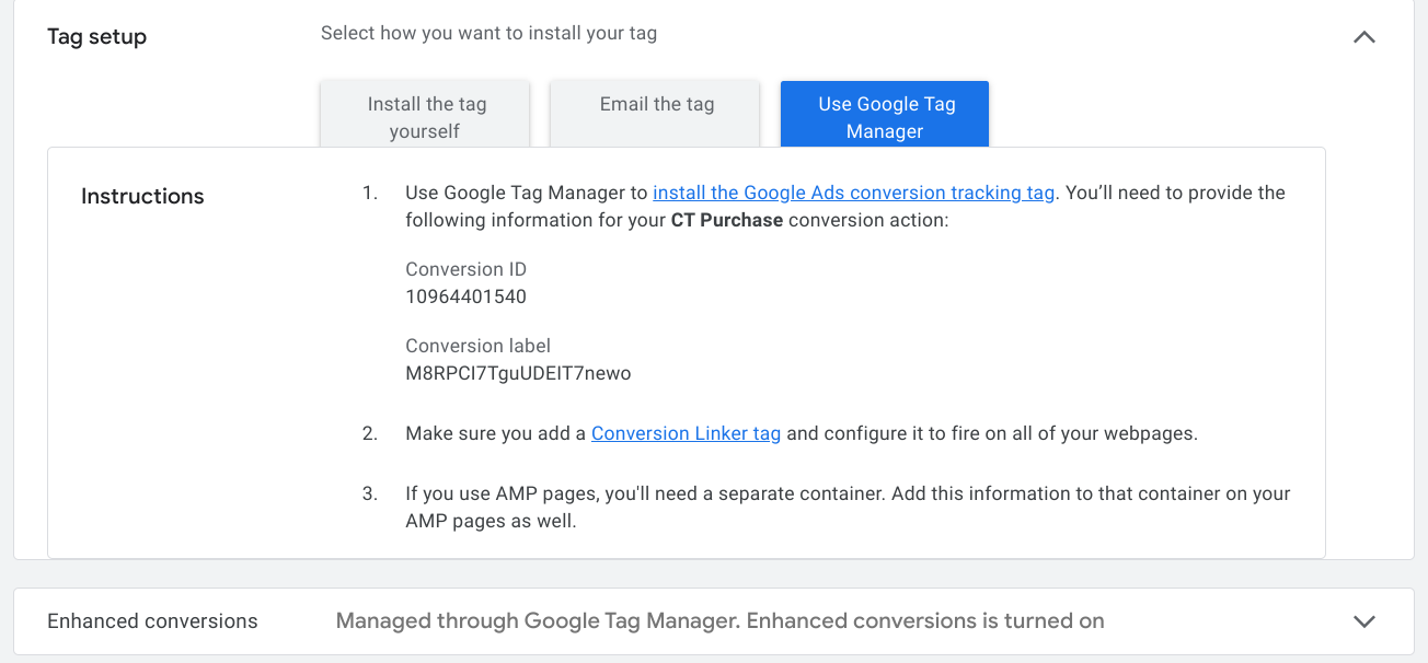 Click ‘Use Google Tag Manager’. Then you will see ‘Conversion ID’ and ‘Conversion label’. Note these as we need them later.