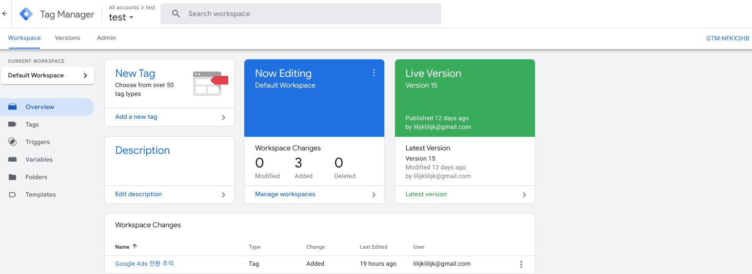 Open your GTM account and click the container Id that starts with 'GTM-' on the top right