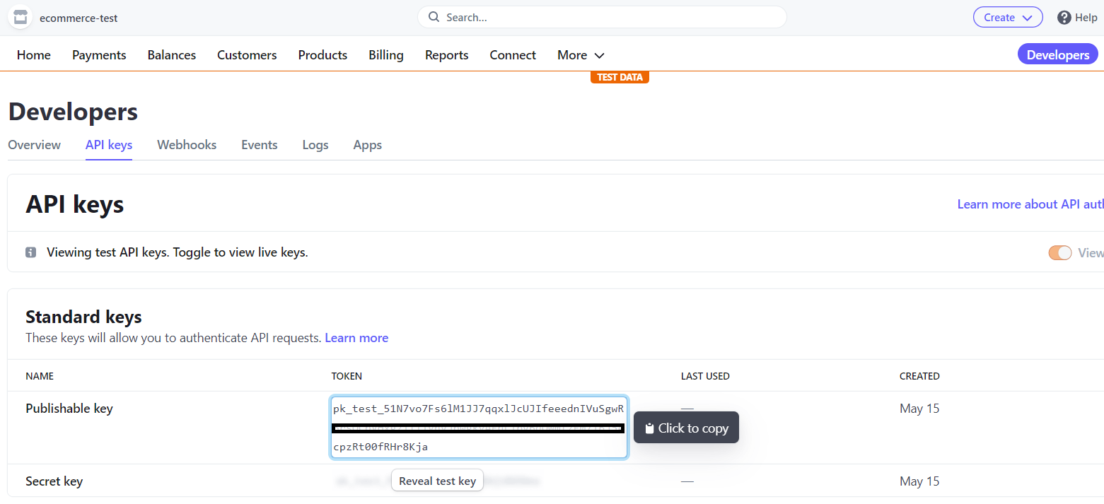 To link the application to Stripe, we need an API key. Go to the Stripe account -> developers -> 'API keys'. Copy the public key and the secret key