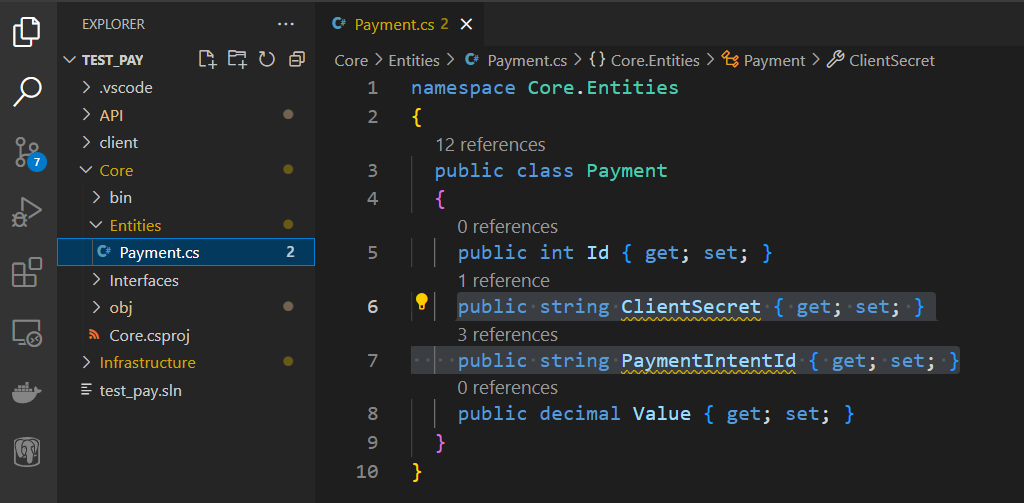 We need an entity to track the necessary information. Add an entity class and add properties. Payment Id and client secret properties are a must to track the payment and confirm the payment.