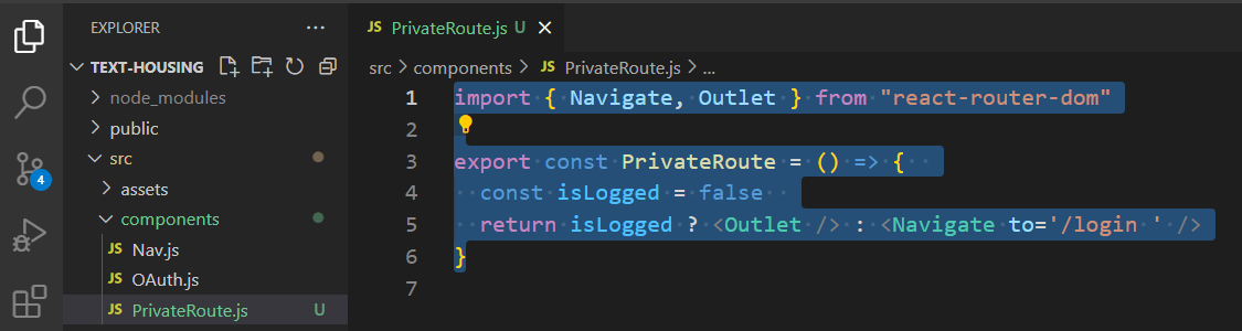 Create a component to check if the user is logged in and to send them depending on the result. Import Navigate and Outlet