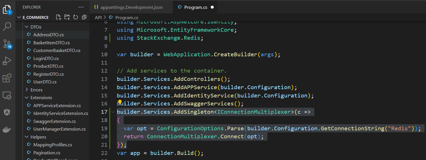 Go to the Program.cs file and add the Redis as a service