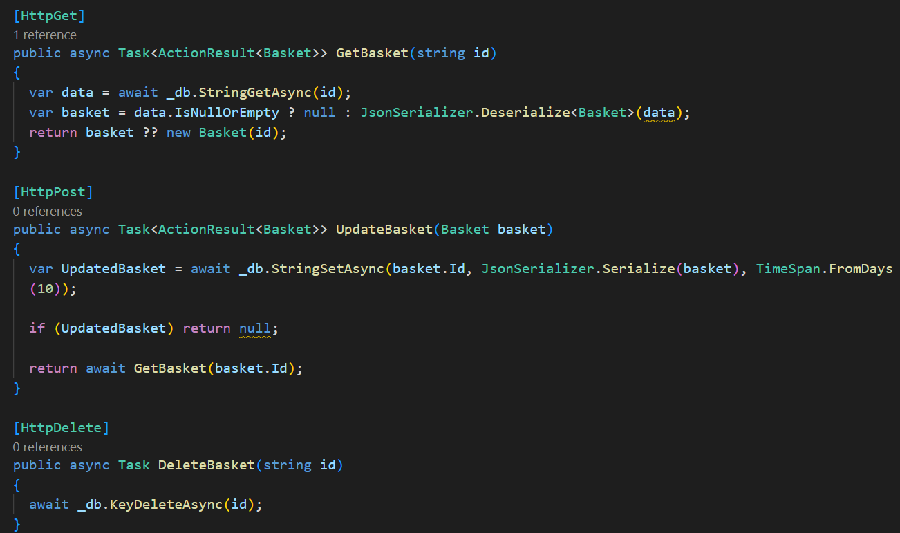 var UpdatedBasket = await _db.StringSetAsync(basket.Id, JsonSerializer.Serialize(basket), TimeSpan.FromDays(10));
