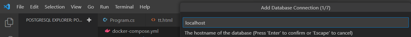 Open appsettings file and add the connection string as an environment variable. The values for each configuration must be identical to the ones you used in the 'docker-compose' file.
