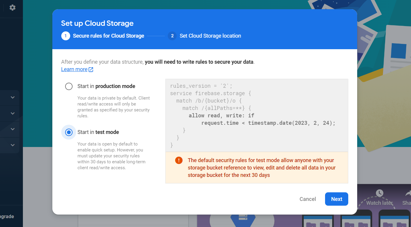 계정으로 로그인한 뒤 좌측 메뉴에서 'Build' -> 'Storage' 선택 후 열린 화면에서 'Get started'를 누릅니다.