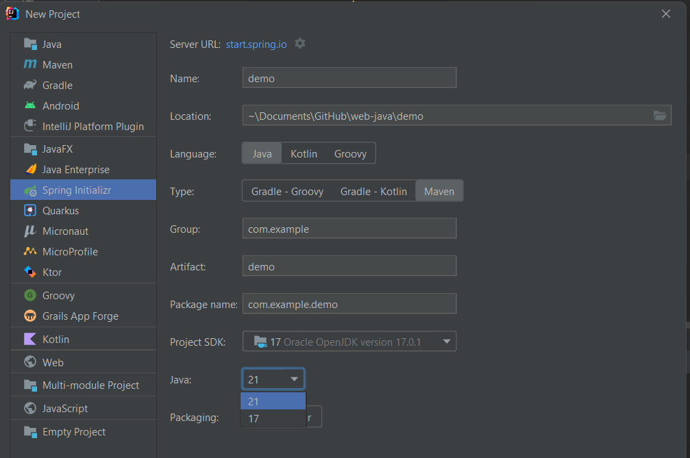 자바 컴파일러 (JDK) 버전과 메이븐 파일의 버전이 불일치할 때 나는 에러로 컴파일러 버전은 반드시 메이븐 버전과 같거나 그 이상이어야 한다. version not supported 에러는 아래와 같이 프로젝트를 생성할 때 SDK와 버전을 확인하지 않고 생성하는 경우 발생한다