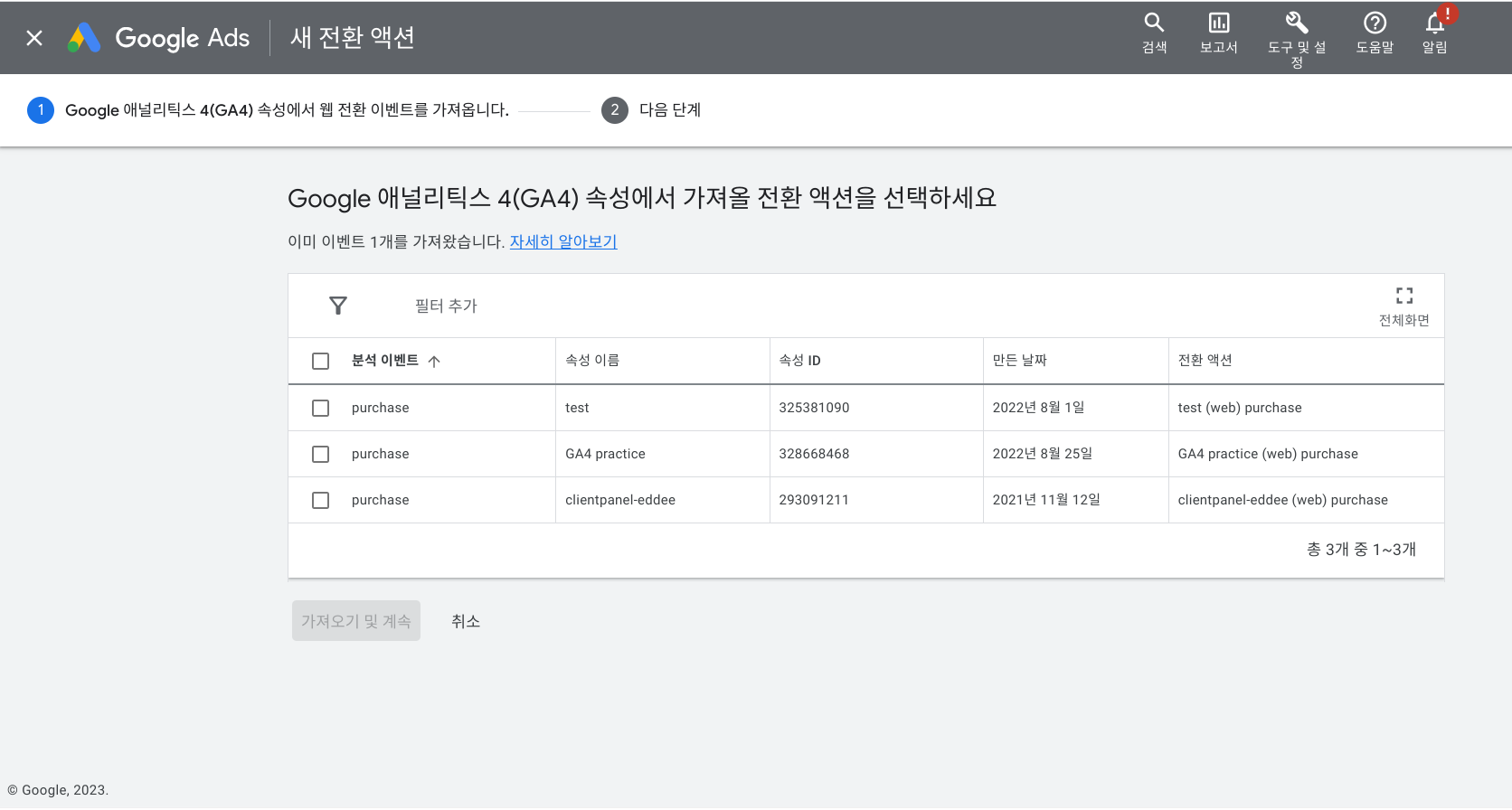 애널리틱스 전환 목록을 구글애즈로 가져갈 수 있습니다.