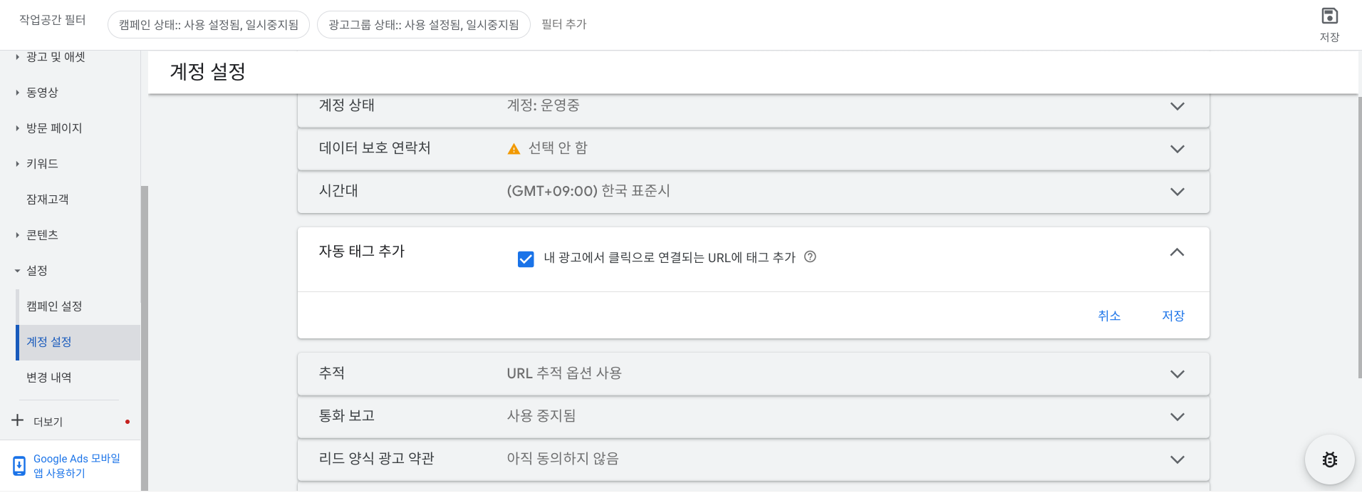 구글 애즈 계정에서 '계정설정' -> '자동태그 추가' -> 체크 해제하고 저장